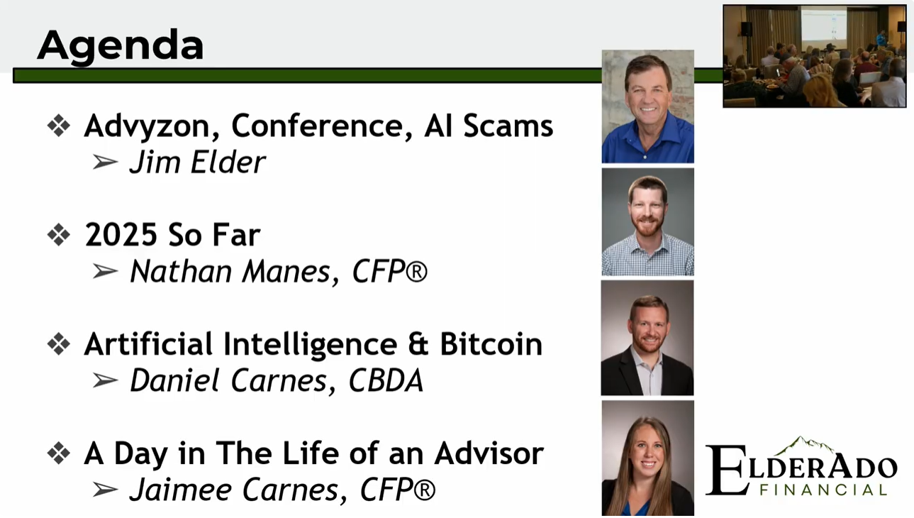 Jim shared some important updates about Morningstar, Advyzon, the Charles Schwab Conference, AI Scams, and Chat GPT. Nathan, one of our Certified Financial Planner(R)s, discusses a review of 2025 so far, current economic conditions, and an outlook. Daniel shared about Artificial Intelligence, investing using AI, pitfalls of AI, Bitcoin overview, and considerations for investing in Bitcoin. Jaimee, a Certified Financial Planner (R), concluded with an overview of “A Day in the Life of An Advisor”. She discussed how we select investments, money savings, the value of tax planning, social security planning, and the importance of estate planning. Feel free to share the replay with a friend. If you have any questions on your specific circumstances, please call or email us.